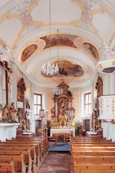 Unsere Kirche ist nicht groß, der einschiffige Raum mit seinem rund abschließenden Altarbezirk ist überschaubar. Durch die barocke Architektur, den Wandschmuck und die Einrichtung aus dem 18. Jahrhundert wirkt das Innere festlich und harmonisch einladend. Die Stuckaturen sind wahrscheinlich vom berühmten Baumeister Johann Bernhard Fischer von Erlach beeinflusst, der zeitgleich um 1700 in der Stadt Salzburg vier bedeutende Barockkirchen erbaut hat. Auch die Orgelempore ist mit farbigem Stuck überzogen. Das zugehörige Relief zeigt passend zum Ort der Kirchenmusik die heilige Cäcilia an der Orgel im Kreis eines munter musizierenden Engelsorchesters.