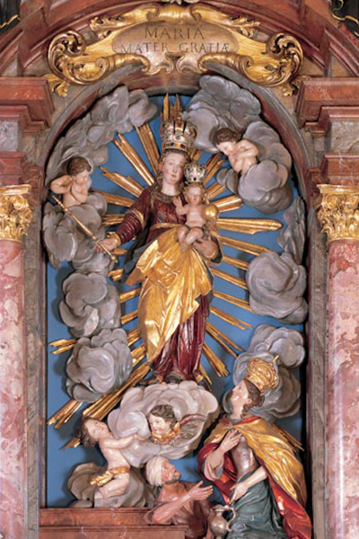 Der barocke Hochaltar stammt aus dem frühen 18. Jahrhundert, ein wenig jünger ist der Tabernakel von 1761. Der Altarschrein zeigt eine geschnitzte Figurengruppe, die vor der Muttergottes Maria und einem Bettler kniende Kirchenpatronin Elisabeth. Ihre linke Hand weist zum Wasserkrug als Sinnbild ihrer Nächstenliebe, die rechte hebt sie an ihr Herz: Dieses Herz hat ganz Gott gehört, nachdem ihr geliebter Mann Ludwig verstorben war. Darüber im Altarauszug befindet sich Gottvater und zuoberst ein Engel mit dem Kreuz als Siegeszeichen.