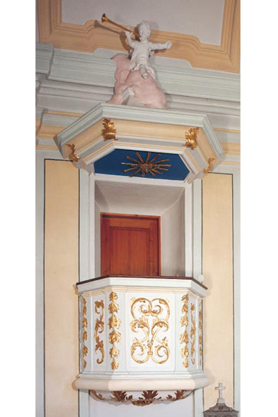 Optisch und künstlerisch fallen aber die alten, vor den liturgischen Reformen des Zweiten Vatikanischen Konzils geschaffenen barocken „Vorgänger“ stärker auf, also Kanzel und Hochaltar.