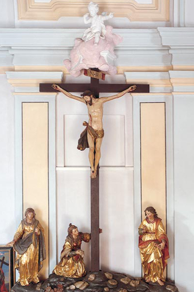 Von hoher künstlerischer Qualität ist die gegenüber der Kanzel angebrachte Kreuzigungsgruppe aus der Zeit um 1620, die stilistisch mit dem berühmten Bildhauer Hans Waldburger in Verbindung gebracht wird. Tiefes seelisches Empfinden spricht aus den Gesichtern der um Jesus Trauernden. Beim Kreuz stehen links Maria und rechts Johannes, in der Mitte kniet Maria Magdalena. Unter diesem Kreuz geschieht alles Tun in unserer Kirche, und das ist ein Bild für unseren Glauben. Denn unter dem Zeichen des Kreuzes vollzieht sich unser ganzes Christsein vom Kreuzzeichen bei der Taufe bis zum Kreuz auf unserem Grab.